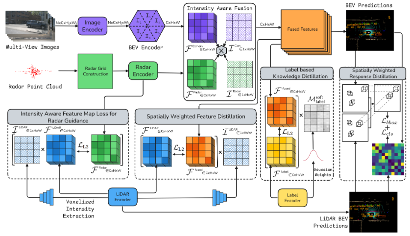 In our most recent paper to be presented at WACV 2026, “IMKD: Intensity-Aware Multi-Level Knowledge Distillation for Camera-Radar Fusion” , we presented a Knowledge distillation method from lidar features that is able to maintain the specific advantages of radar features while enhancing them: